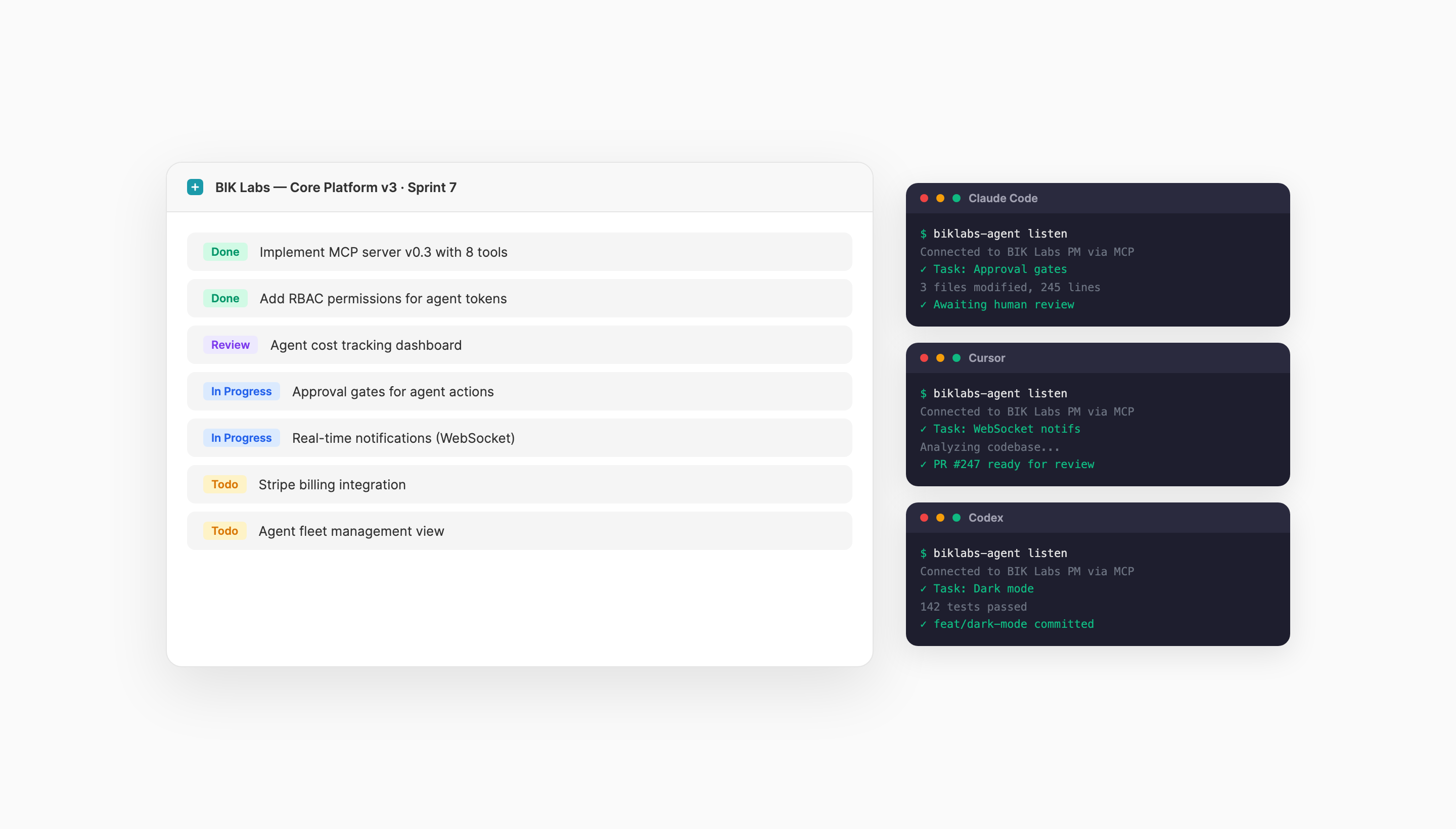 Conecta Claude Code, Cursor, Windsurf, Codex o cualquier agente compatible con MCP en menos de 2 minutos. Se ejecutan en tu terminal, con tus credenciales, en tu máquina. BIK Labs coordina. Tu IDE ejecuta. Sin ejecución en la nube. Sin vendor lock-in. Sin sorpresas.